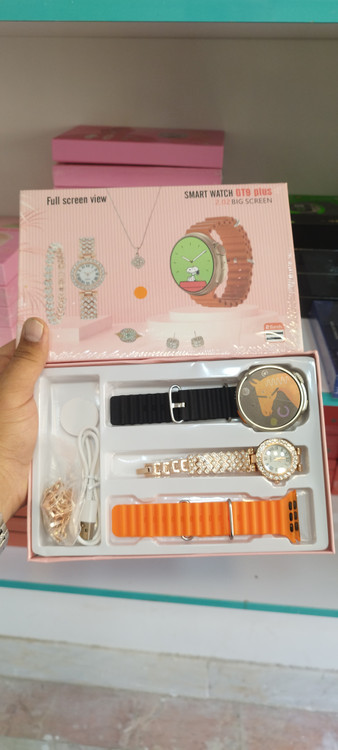 ⌚پک ساعت هوشمند مدل: GT9 plus ویژگی های کالا👇 مناسب برای : بانوان نوع کاربری : ورزشی - مجلسی _ روزمره فرم صفحه : دایره جنس بدنه : آلومینیوم جنس بند : سیلیکون نوع قفل بند : پینبند_ سگک توضیحات رنگ بند و بدنه : رنگ بدنه ساعت مشکی و دارای 2 بند رنگ بندی اقلام همراه پک کامل👇 1️⃣ : 2عدد ساعت هوشمند و مجلسی 2️⃣ : کابل شارژ وایرلس ساعت 3️⃣ : 2عدد بند _یک دستبند _ گوشواره _ انگشتر _گردنبند