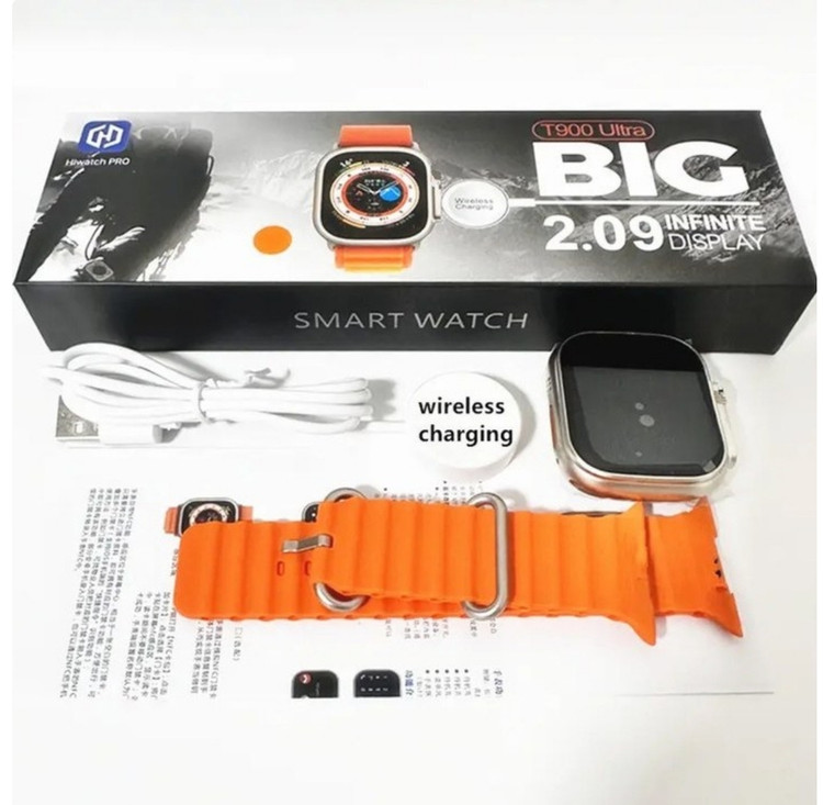 ساعت هوشمند مدل t900 اولترا که در دو مدل جنس داخل بازار موجود است 1- شرکت سازنده: تاپ وان با صفحه نمایش کوچک و حاشیه دار 2-شرکت hiwatch با صفحه نمایش بزرگ 49 میلیمتری بدون حاشیه